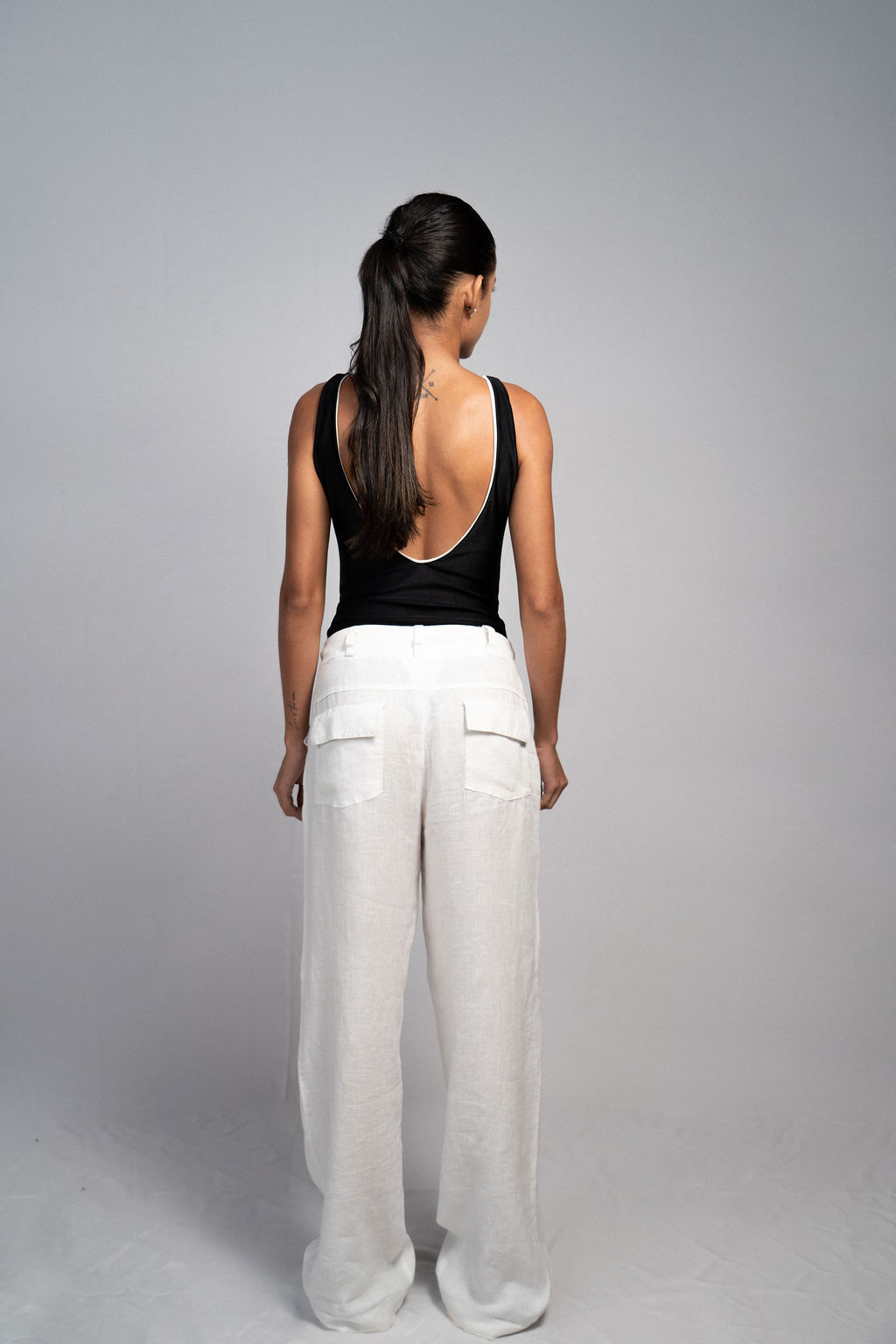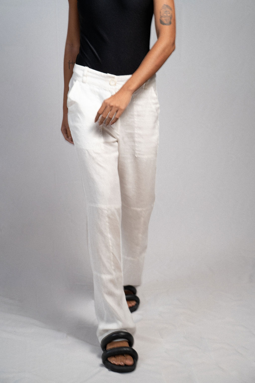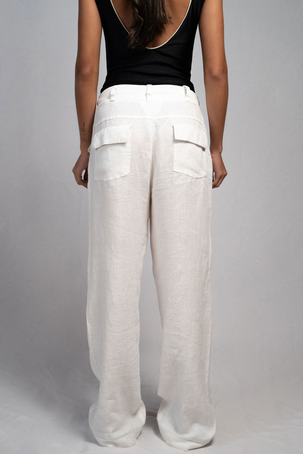 Calça modelagem wide leg com bolsos faca laterais e recortes, passante para cinto, fechamento frontal por zíper e abotoamento no cós, não possui forro. Peça sofisticada, confortável, de linho puro e que nos permite usar em todas as estações, por ser um tecido leve e fresco. Combine com nossa camisa em também em linho.